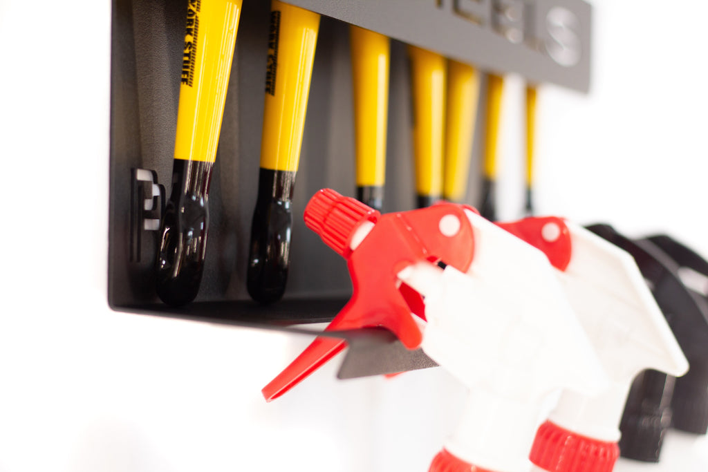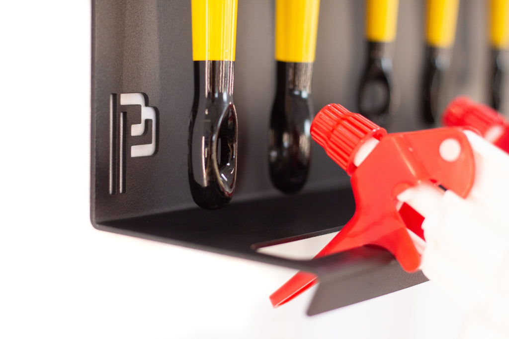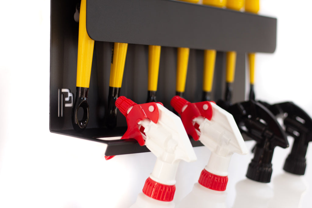 The Poka Premium Brush and Bottle Holder features 7 upper holes in two sizes and suitable for most brush sizes. The lower channel is suitable for most types of sprayers. Once mounted the solid structure will hold up to 10kg.